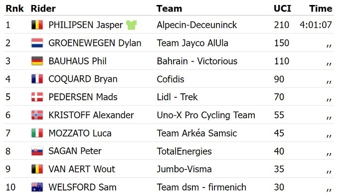 Для Филипсена это четвертая победа на нынешнем Туре. В общем зачете изменений не произошло – лидировать продолжает датчанин Йонас Вингегор из «Jumbo Visma».