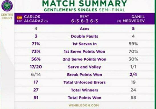 Clinical Carlos 😮💨@carlosalcaraz comfortably moves past No.3 seed Daniil Medvedev 6-3, 6-3, 6-3 to move into his first Wimbledon final 🙌#Wimbledon pic.twitter.com/ZJO1hlYcOI