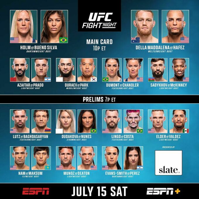 - Главный бой: Холли Холм (США, 15–6) – Майра Буэно Силва (Бразилия, 10–2–1)