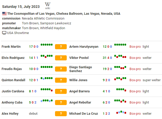 Экс-чемпион мира в первом полусреднем весе Виктор Постол из Украины (31–4, 12 KO) проведет поединок с Элвисом Родригесом из Доминиканской Республики (14–1–1, 12 KO).