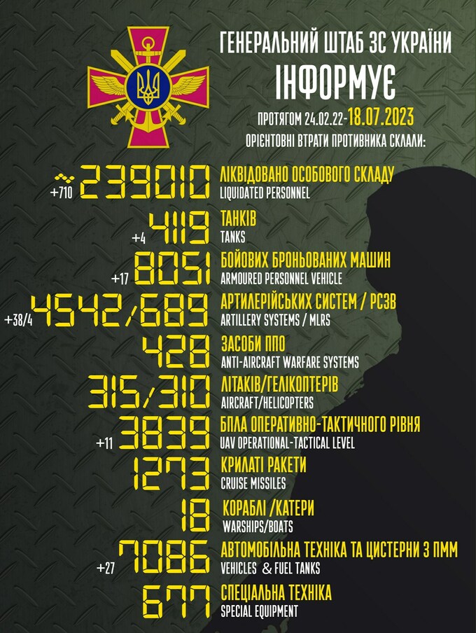 Предлагаем вашему вниманию сводку общих боевых потерь россии с 24.02.2022 по 18.07.2023.