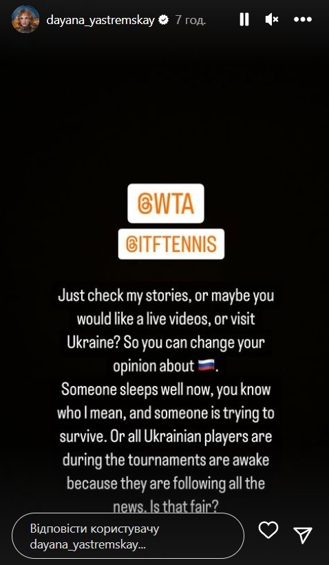 Кто-то хорошо спит сейчас, вы знаете, о ком я, а кто-то пытается выжить. Либо все украинские игроки в течение турниров не спят, потому что следят за новостями. Это справедливо?», – написала 23-летняя Даяна.