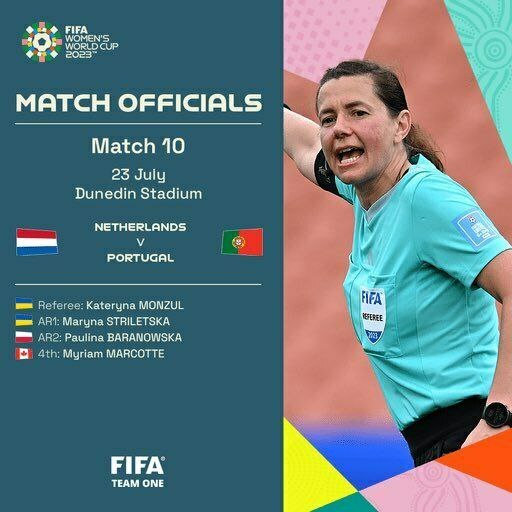 Решением ФИФА, 23 июля матч групповой стадии мундиаля между сборными Нидерландов и Португалии будет судить 42-летняя харьковчанка Катерина Монзуль. На линиях ей будут помогать Марина Стрелецкая из Сум, а также Паулина Барановска из Польши.