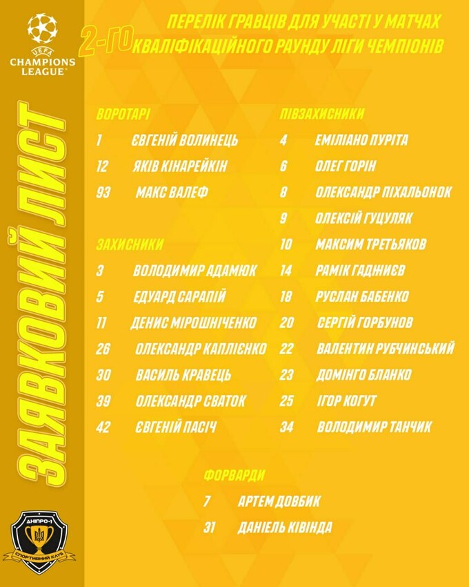 Клуб «Днепр-1» сообщил о том, что сформирована заявка команды для участия во втором квалификационном раунде Q2 Лиги чемпионов.