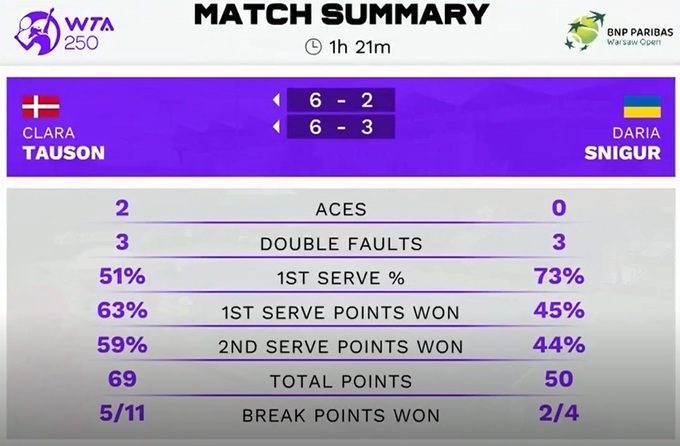 Дарья Снигур (Украина) – Клара Таусон (Дания) – 2:6, 3:6