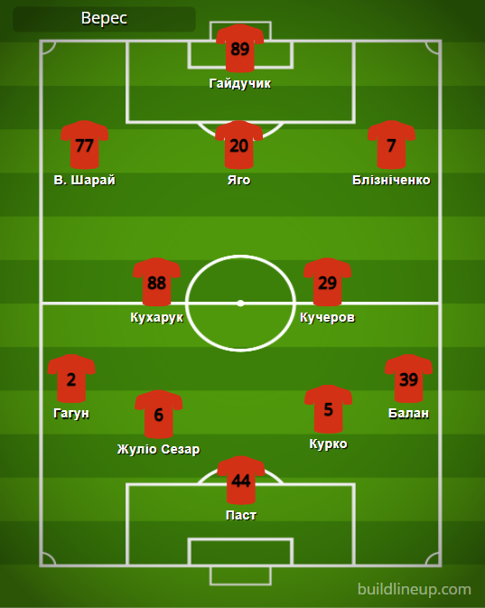 «Верес»: Паст – Гагун, Жулио Сезар, Курко, Балан – Кухарук (Шестаков, 74), Кучеров – В. Шарай (Дахновский, 74), Яго (С. Шарай, 79), Близниченко – Гайдучик (Марусич, 46).