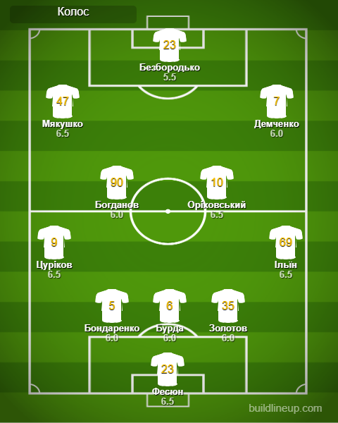«Колос»: Фесюн, Цуриков, Бондаренко, Бурда, Золотов, Ильин (Лучкевич, 76), Ориховский, Богданов, Мякушко, Демченко, Безбородько (Велетень, 76).
