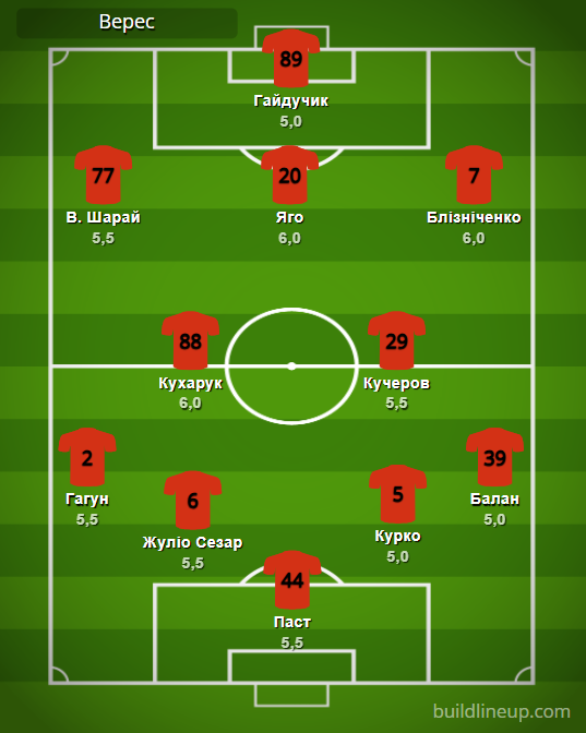 «Верес»: Паст – Гагун, Жулио Сезар, Курко, Балан – Кухарук (Шестаков, 74), Кучеров – В. Шарай (Дахновский, 74), Яго (С. Шарай, 79), Близниченко – Гайдучик (Марусич, 46).