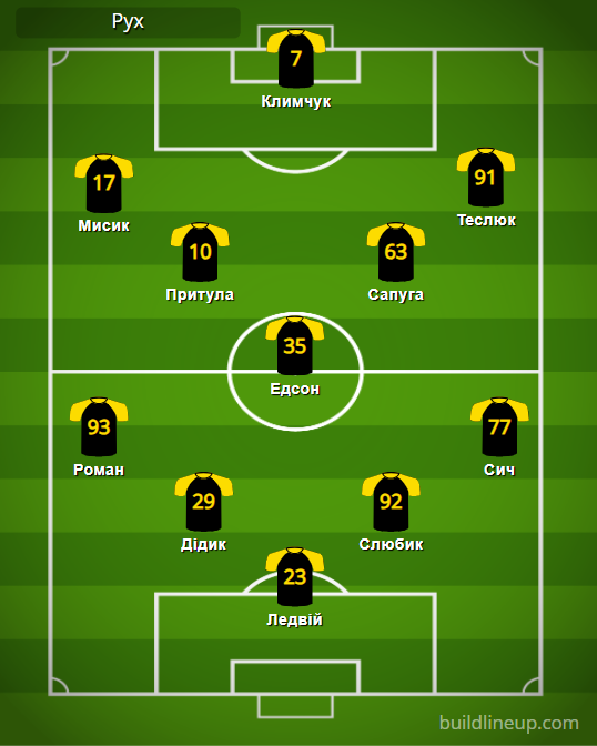 «Рух»: Ледвий – Роман, Дидык (Слюсар, 87), Слюбык, Сыч – Притула (Пастух, 83), Эдсон, Сапуга – Мисик (Рунич, 64), Климчук, Теслюк (Квасница, 65).