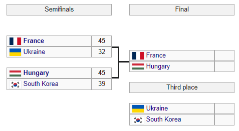 Сборная Украины в поединке за путевку в финал проиграла команде Франции (32:45), а в другом полуфинале Венгрия обыграла Южную Корею (45:39).