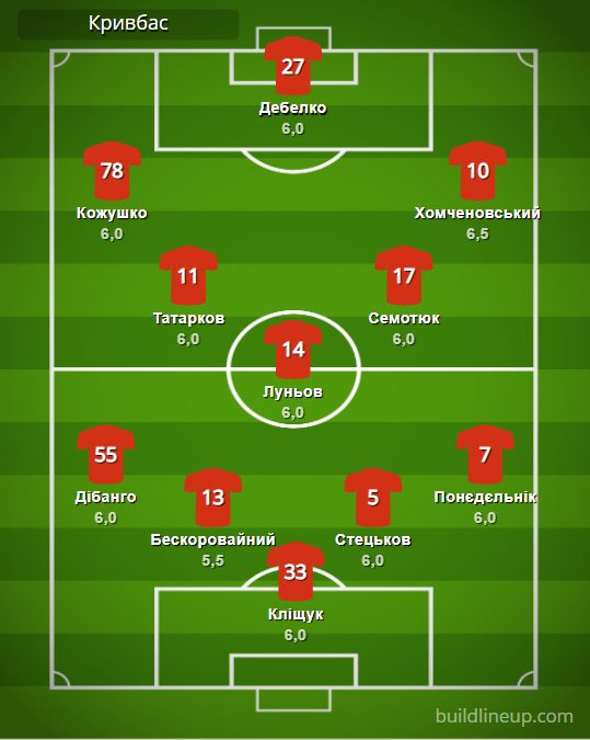 «Кривбасс»: Клищук – Дибанго, Бескоровайный, Стецьков, Понедельник – Татарков (Бизимана, 46), Лунев (Устименко, 79), Семотюк – Кожушко (Близниченко, 78), Дебелко (Илич, 46), Хомченовский (Задерака, 85).
