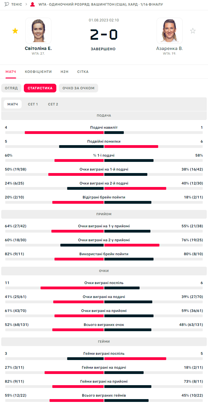 Элина Свитолина (Украина) – Виктория Азаренко (без флага) – 7:6 (7:2), 6:4