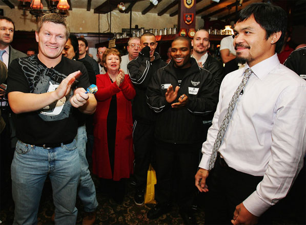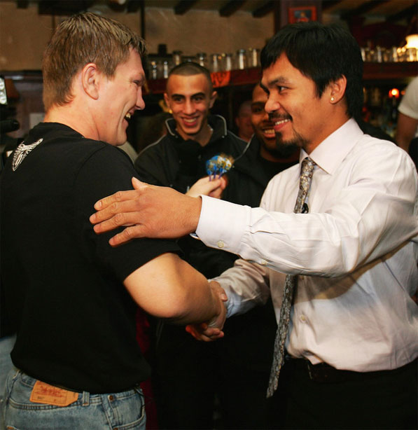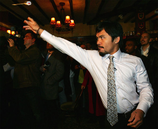 Мэнни Пакьяо прибыл в гости к своему будущему сопернику Рикки Хаттону. Развлекались боксеры популярным в Британии способом, сыграли в дартс. Победу, конечно же, одержал Хаттон, который наверняка побольше Мэнни занимался этим делом.