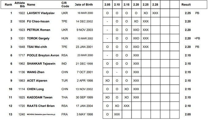 Владислав Лавский стал чемпионом в этом секторе, он единственный взял 2,25 м. Это личный рекорд украинца. Следующей он штурмовал высоту 2,28 м, однако планка не устояла.
