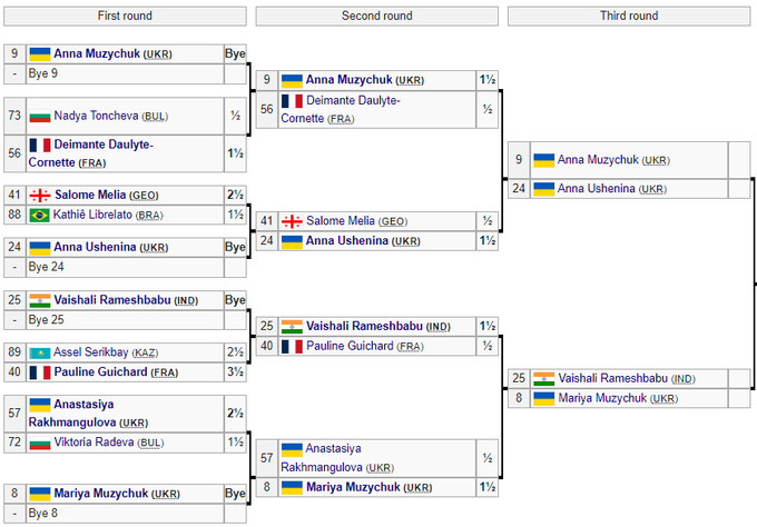 - Анастасия Рахмангулова (Украина) [57] – Мария Музычук (Украина) [8] – 0,5:1.5