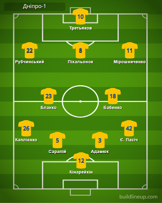 «Днепр-1»: Кинарейкин – Каплиенко, Сарапий, Адамюк, Е. Пасич (Танчик, 46) – Бланко, Бабенко – Рубчинский (Когут, 63), Пихаленок, Мирошниченко (Сваток, 66) – Третьяков (Кивинда, 63).