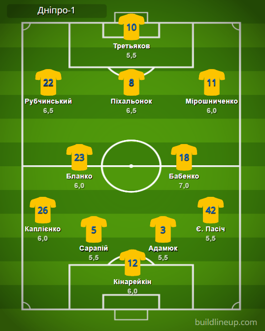 «Днепр-1»: Кинарейкин – Каплиенко, Сарапий, Адамюк, Е. Пасич (Танчик, 46) – Бланко, Бабенко – Рубчинский (Когут, 63), Пихаленок, Мирошниченко (Сваток, 66) – Третьяков (Кивинда, 63).