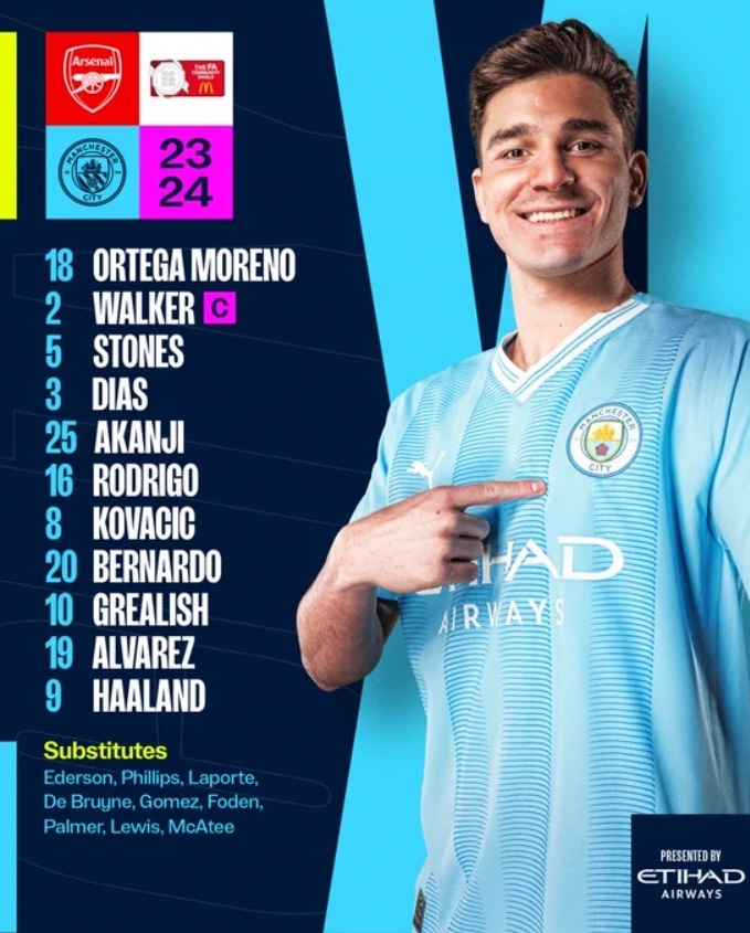 «Манчестер Сити»: Ортега, Уокер, Стоунз, Рубин Диаш, Аканджи, Родри, Ковачич, Бернарду Силва, Грилиш, Альварес, Холанд.
