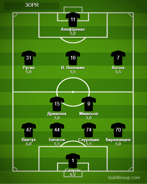 «Заря»: Сапутин - Кирюханцев, Батагов, Снурницын (Гулько, 59), Вантух - Дрышлюк (Нагнойный, 69), Мишнев - Антюх (Бугай, 59), В. Волошин (Тлумак, 84), Русин - Алефиренко (Мичин, 59).
