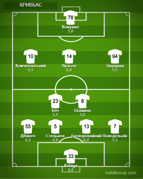 «Кривбасс»: Клищук - Понедельник, Бескоровайный, Стецьков, Дибанго - Бизимана (Приходько, 46), Илич (Татарков, 58) - Задерака, Лунев (Вакулко, 85), Хомченовский - Кожушко (Вакулко, 77).