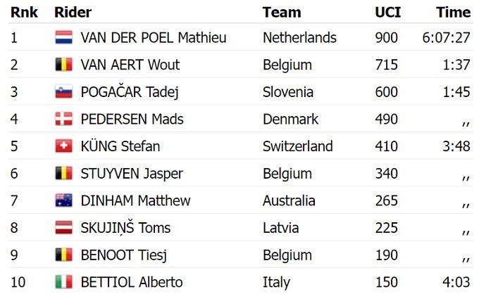 Серебро завоевал бельгиец Воут Ван Арт, бронза – у словенца Тадея Погачара. Прошлогодний чемпион, Ремко Эвенпул, проиграл более 10 минут.