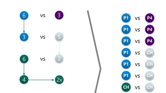 - Пары 1–3: любые три из шести команд с приоритетом 1 играют против трех команд с приоритетом 4.