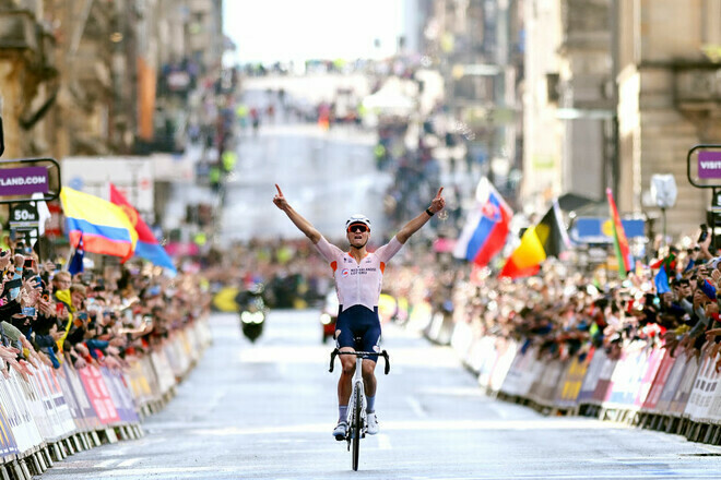 Трасса групповой гонки в Глазго на первый взгляд выглядела относительно простой по рельефу, но это лишь на бумаге. Да, общий набор высоты не впечатлял, более-менее длинных подъемов нет, брусчатки и других сложностей покрытия тоже. Но было просто бесчисленное множество коротких, но очень крутых городских холмов, и это, в совокупности с множеством технически сложных участков, делало гонку невероятно аритмичной и, как следствие, сложной. До финиша добрался лишь 51 гонщик, а разрыв между первым и 10-м местами составил более 4 минут – впечатляющие цифры.
