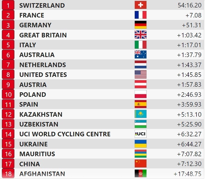 Сборная Швейцарии по велоспорту выиграла смешанную гонку с раздельным стартом на чемпионате мира 2023 года в Шотландии. Швейцарцы защитили свой титул годичной давности, выступая в том же составе, что и год назад: Марлен Ройссер, Элиз Шаббе, Николь Коллер, Штефан Кюнг, Мауро Шмид, Штефан Биссеггер.