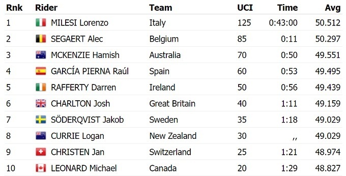 Итальянский велогонщик Лоренцо Милези выиграл индивидуальную гонку с раздельным стартом среди молодежи (до 23 лет) на 36,2 км на объединенном чемпионате мира 2023 года в Шотландии. Он на 11 секунд опередил представителя Бельгии Алека Сегарта, топ-3 замкнул австралиец Хэмиш Макензи.