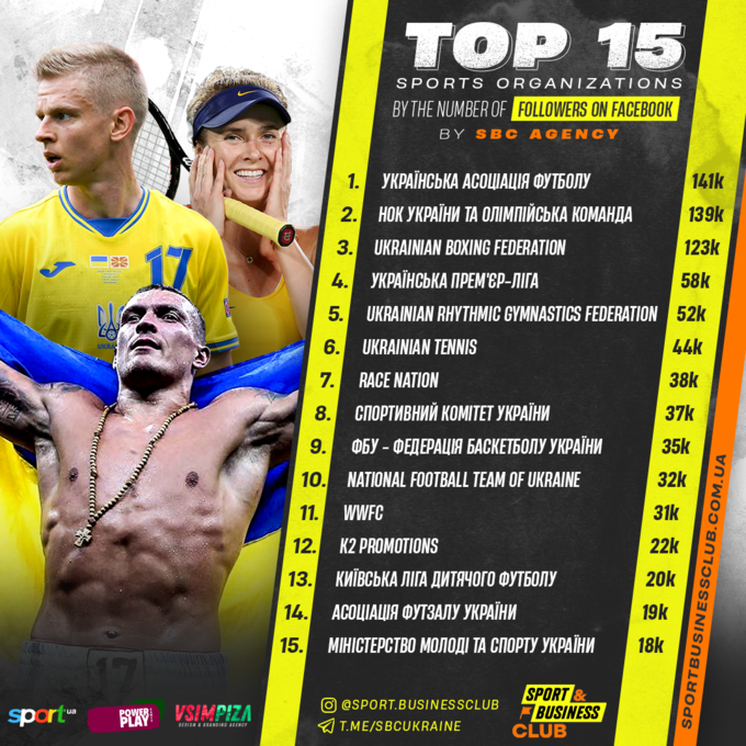 Прикладами “до чого можна прагнути” серед українських спортивних організацій є федерації баскетболу (35 000) та боксу (123 000), футбольна Українська Прем’єр-Ліга (41 000), Національний олімпійський комітет (139 000) та Українська асоціація футболу (141 000). Безліч статистичних матеріалів, інформація про проведені заходи, анонси турнірів, приваблива графіка, відео-матеріали та якісні фото – це є залогом успіху в соціальних мережах для будь-кого.
