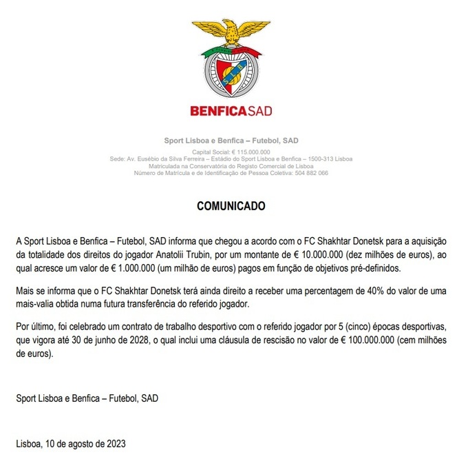 Также указана клаусула, которая прописана в контракте Трубина. Она составляет 100 миллионов евро. Контракт украинца с «Бенфикой» рассчитан на пять лет – до лета 2028 года.