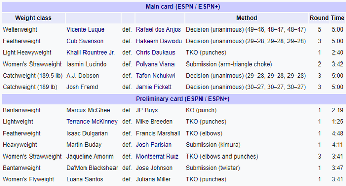 В главном бою встретились два бразильца: Висенте Луке (21–9–1) и Рафаэль Дос Аньос (32–14)