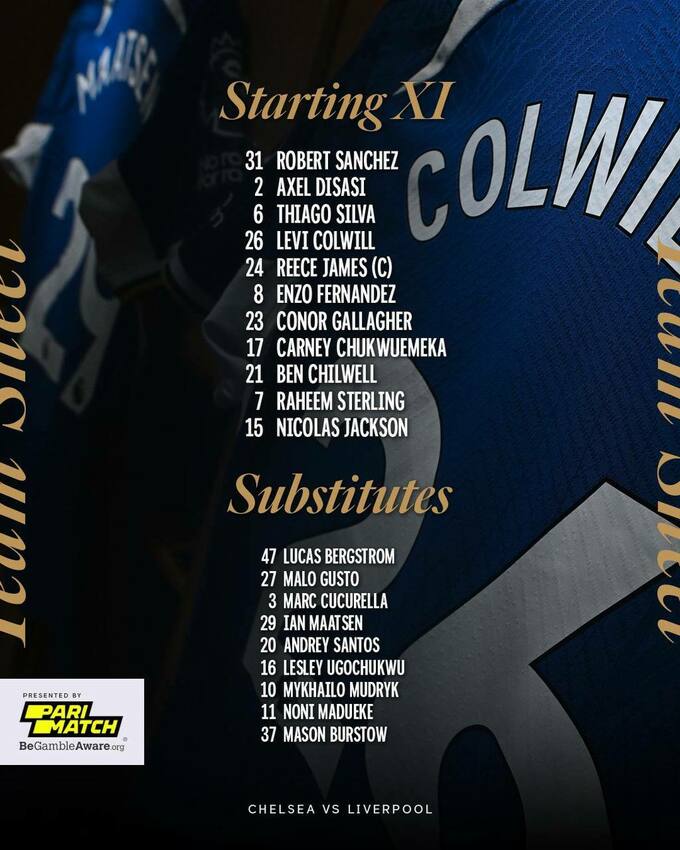 «Челси»: Санчес, Дисаси, Тиаго Силва, Колуилл, Джеймс, Энцо Фернандес, Галлахер, Чуквуэмека, Чилуэлл, Стерлинг, Джексон