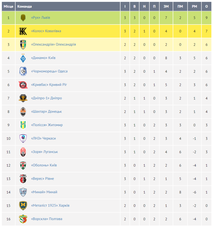 Первое место неожиданно занимает львовский «Рух», который выиграл все 3 матча на старте сезона (9 очков).