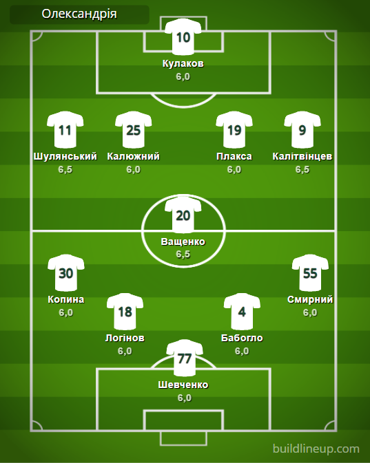 «Александрия»: Шевченко – Копына (Мартынюк, 81), Логинов, Бабогло, Смирный – Ващенко (Погорелый, 82) – Шулянский (Джевани, 72), Калюжный (Скорко, 46), Плакса (Ковалец, 62), Калитвинцев – Кулаков.