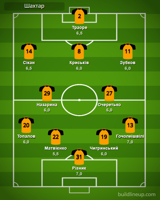 «Шахтер»: Ризнык – Топалов, Матвиенко, Чигринский (Козик, 74), Гочолеишвили – Назарина, Очеретько – Сикан (Вьюнник, 46), Криськив (Кастилло, 89), Зубков (Невертон, 82) – Траоре (Келси, 46).