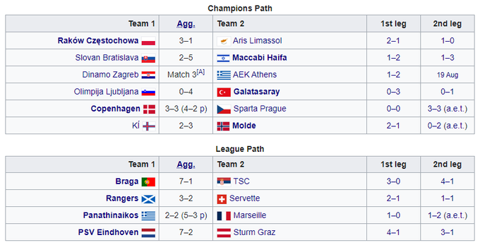 Самым интересным стал матч между командами «Марсель» (Франция) и «Панатинаикос» (Греция). Гостям удалось отыграться по сумме двух игр на 90+9 минуте ударом с точки и выиграть по пенальти.