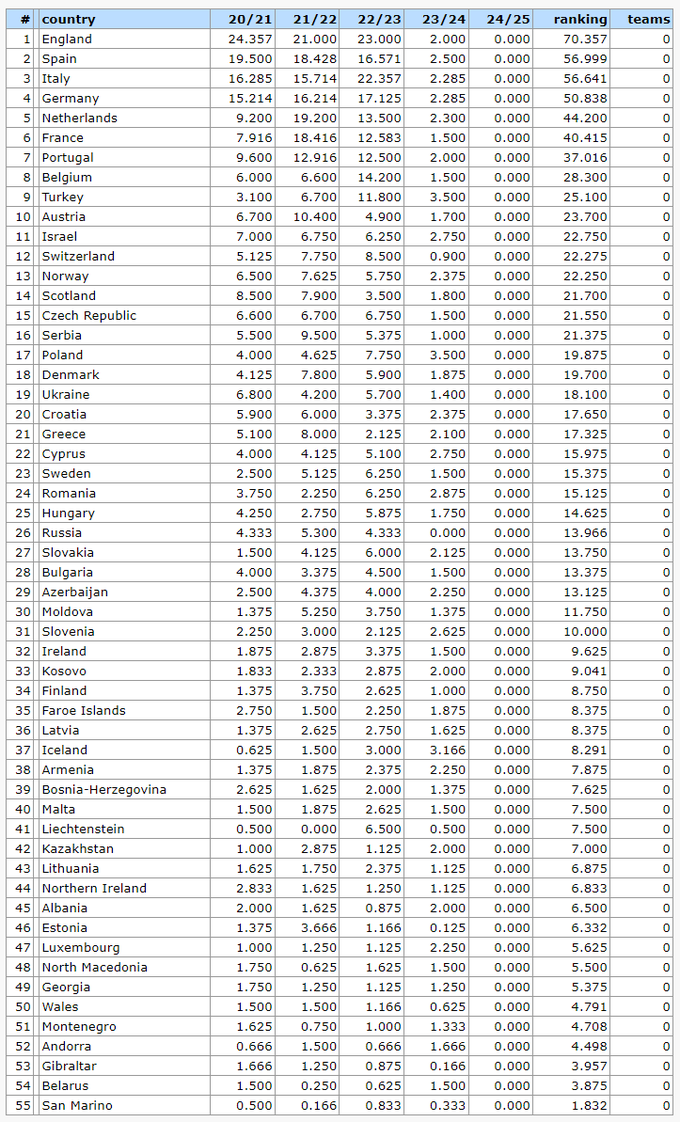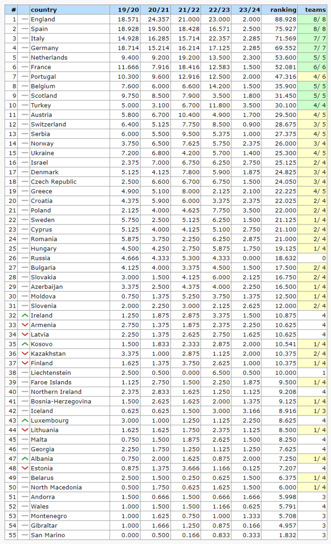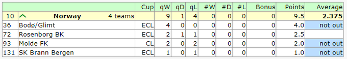 Норвегия, идущая на 14-й позиции, увеличила отрыв от Украины с 0.250 до 0.700 балла с тремя клубами в строю.
