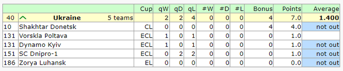 Клубы Украины с одной победой и одной ничьей прибавили +0.300 за неделю и имеют 25.300 балла, это 15-я позиция в пятилетнем рейтинге. В сезонном рейтинге Украина имеет 1.400 и находится на 40-м месте (среди 55 стран).