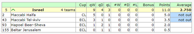 В текущем сезоне у Израиля уже 2.750, и этот показатель – в топ-5 лучших. Турция и Польша пока имеют больше всех (по 3.500), далее – Исландия (3.166) и Румыния (2.875).