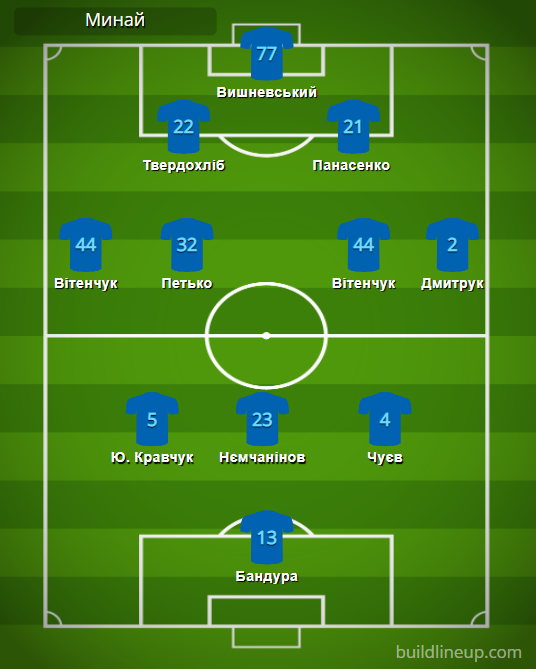 «Минай»: Бандура – Ю. Кравчук, Немчанинов (Колесник, 82), Чуев – Рогозинский (Булеза, 46), Петько, Витенчук, Дмитрук – Твердохлеб, Панасенко (Одарюк, 14, Гечев, 82) – Вишневский.