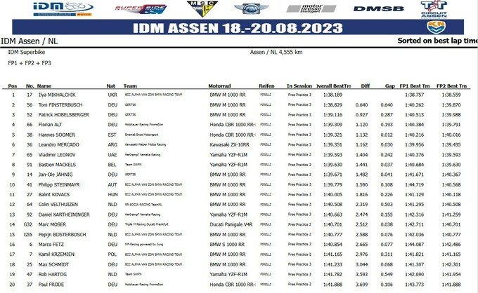 Украинский райдер Илья Михальчик, выступающий за заводскую команду BMW, стал лучшим по результатам трёх пятничных практик этапа немецкого чемпионата IDM в классе Superbike на трассе в нидерландском Ассене.