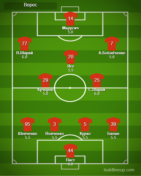 «Верес»: Паст, Вовченко, Курко, А.Близниченко (Гайдучик, 88), Марусич, Яго (Гагун, 78), С.Шарай (Свитюха, 78), Балан (Гакман, 64), Кучеров, В.Шарай, Шевченко.