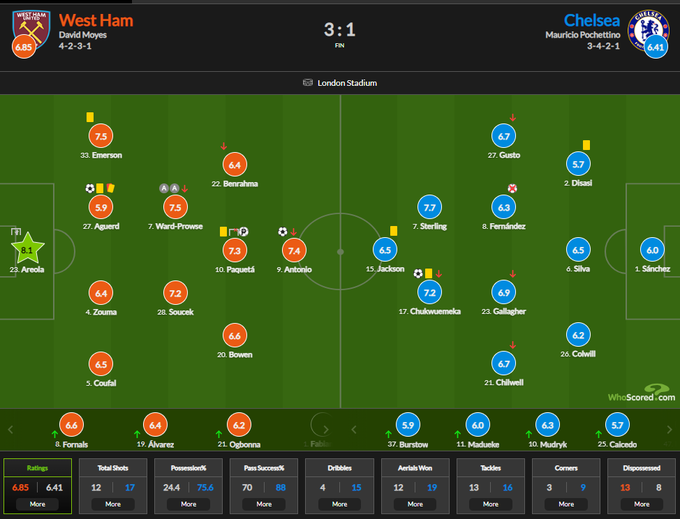 Мудрик получил от Whoscored за игру оценку ниже среднего – 6.3. Самую высокую оценку в матче получил голкипер молотобойцев Альфонс Ареола (8.1).