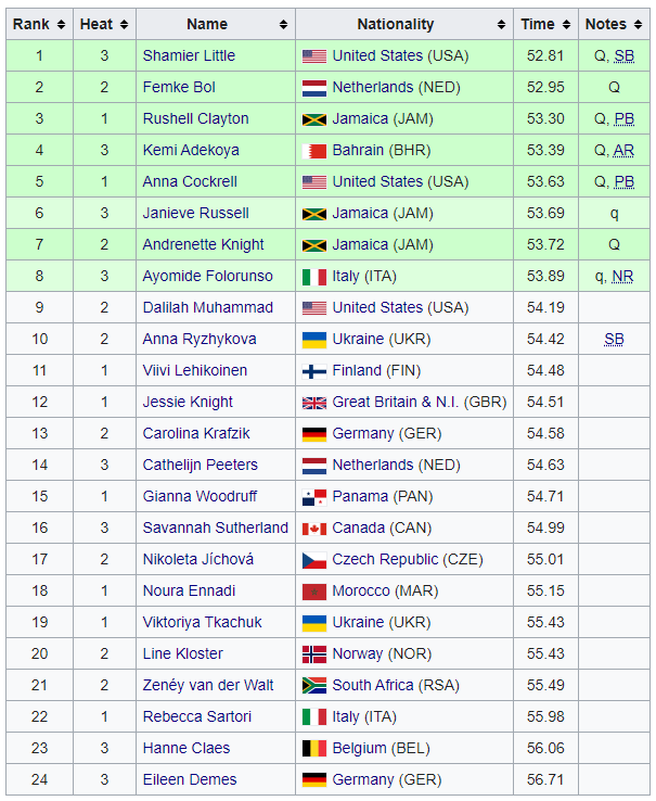 В финал на ЧМ-2023 в беге на 400 метров с барьерами прошли американки Шамье Литтл, Анна Кокрелл, нидерландка Фемке Бол, ямайские бегунки Рашелл Клейтон, Джаньев Расселл, Андренетт Найт, а также представительница Бахрейна Кеми Адекойя, а также Айомид Фолорунзо из Италии.