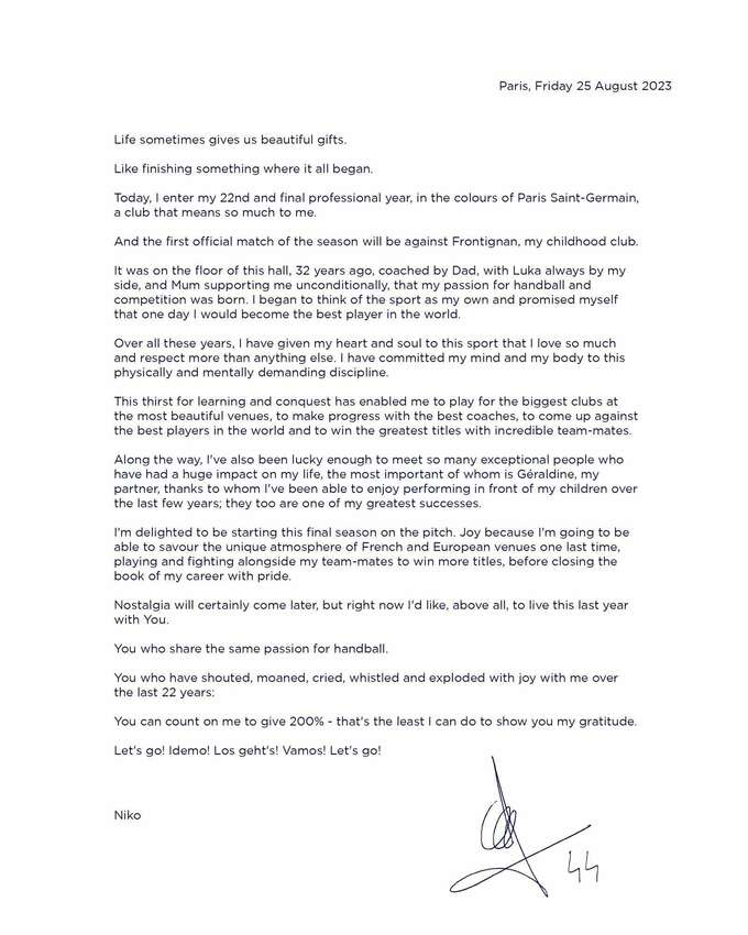 «Я рад начать последний сезон на площадке. Радуюсь, потому что я смогу в последний раз насладиться уникальной атмосферой французских и европейских арен, играя и сражаясь вместе со своими товарищами по команде, чтобы выиграть больше титулов, прежде чем с гордостью закрыть книгу своей карьеры», — написал Карабатич в своем письме болельщикам.