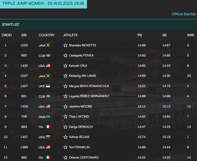 ЧМ-2023. Тройной прыжок. Женщины. Финал. Стартовый лист