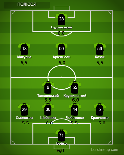 «Полесье»: Бойко - Кравченко, Чоботенко, Шабанов, Смоляков - Крушинский (Кушниренко, 58), Танковский (Огиря, 65) - Козак (Назаренко, 58), Ариелсон, Макуана - Будковский.