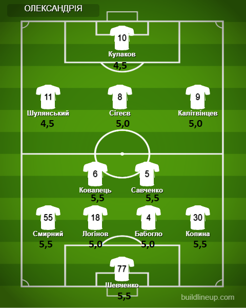 «Александрия»: Шевченко – Копына, Бабогло, Логинов, Смирный (Калюжный, 81) - Савченко (Эрнандес, 46), Ковалец (Плакса, 46) - Калитвинцев, Сигеев, Шулянский (Скорко, 58) - Кулаков (Погорелый, 68).