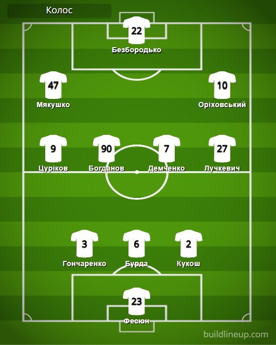 «Колос»: Фесюн - Гончаренко, Бурда, Кукош – Цуриков, Богданов (Болбат, 41), Демченко (Велетень, 60), Лучкевич – Мякушко (Рангел, 82), Безбородько (Салабай, 46), Ореховский.